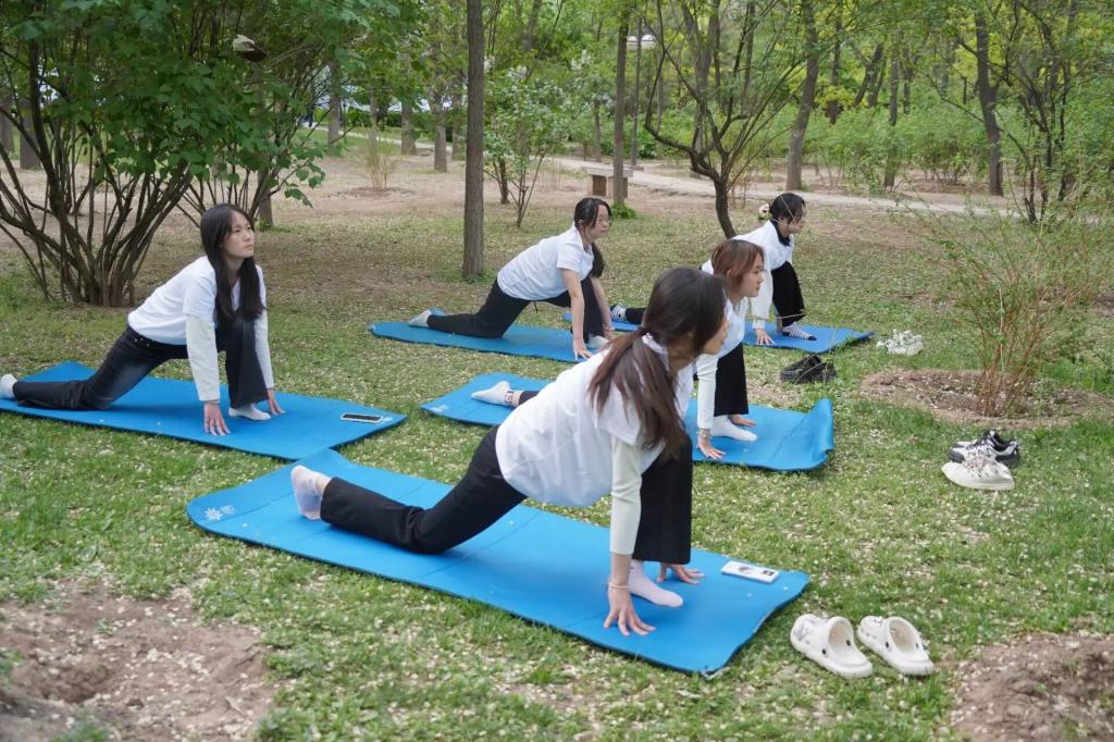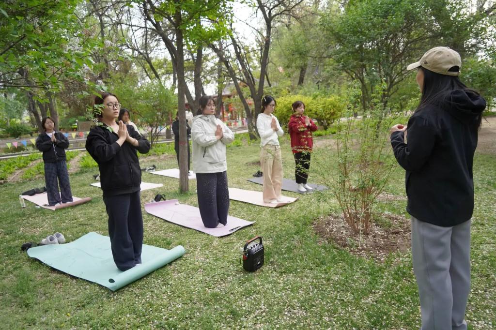 活动中,参与者在林间草坪有序开展瑜伽练习。社团成员围绕基础瑜伽动作与呼吸调理方法进行示范讲解,引导大家在自然环境中舒展身心、调节气息,舒缓学业与生活压力。同学们凝神专注、规范练习,在静谧氛围中实现身心放松,切实感受瑜伽运动带来的积极体验。